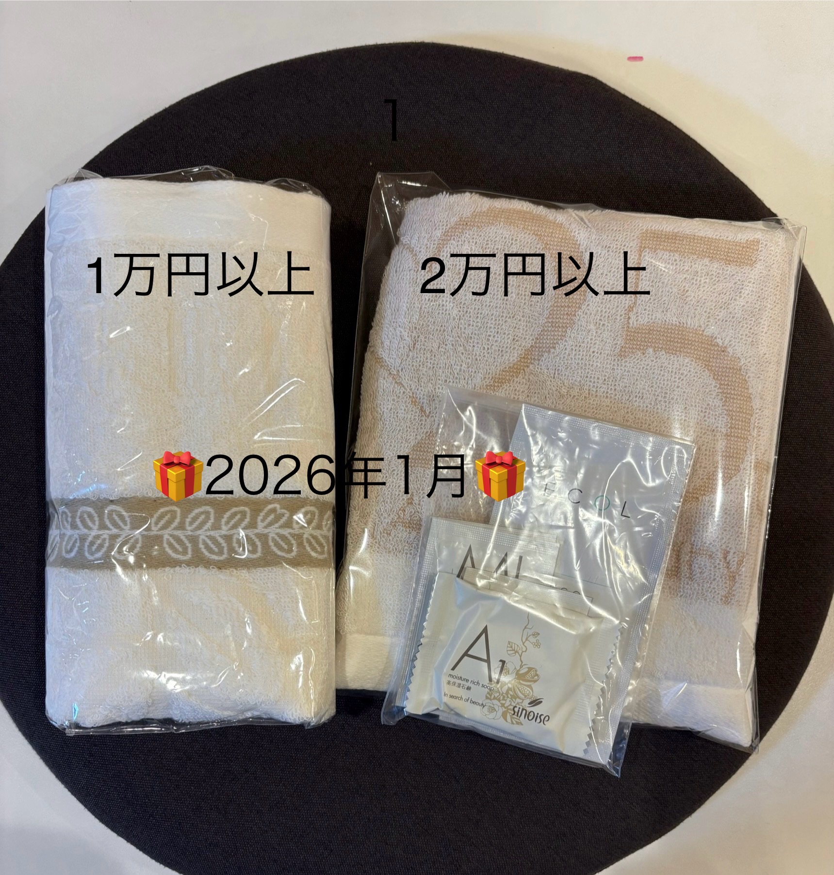 2026年もよろしくお願いいたします。年始は5日10時より営業いたします。今年はシナリーが誕生して25年を迎えます。毎年恒例の1月お年賀タオルプレゼントですが、2コースご用意しました。1万円以上お買い上げの方に高級オリジナルタオルを、2万円以上お買いあげの方には25周年タオルとサンプルセットになります。シナリーを使って素肌も綺麗、メイクアップ素敵な仲間